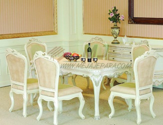 Meja makan mewah merupakan meja makan yang didesain untuk ruangan makan rumah anda untuk membuat rumah anda akan menjadi lebih indah untuk dihuni. Untuk anda ibu-ibu rumah tangga yang suka mempercantik ruangan anda meja makan ini bisa sebagai alternatif untuk membuat anda menjadi wanita sempurna dengan memiliki meja makan mewah ini. Meja makan mewah 002 ini sangat cocok untuk anda yang senang membuat acara keluarga untuk menyantap makan dengan rekan- rekan anda atau keluarga anda, meja makan ini dilengkapi dengan 6 kursi duduk yang tiap kursinya ada ukirannya dan dijok sehingga akan membuat duduk anda ketika makan malam dengan keluaraga menjadi nyaman selain dengan dilengkapi dengan 6 dan 1 meja yang berbentuk persegi panjang yang menambah keindahan tersendiri untuk membuat hidangan anda menjadi banyak untuk dihidangkan di meja makan mewah 002 ini.