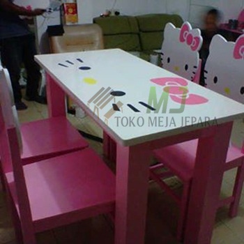 Model meja makan hello kitty minimalis merupakan produk mebel jepara yang saat ini banyak diincar oleh konsumen berbagai penjuru. Kami sengaja memproduksi set meja makan ini untuk melengkapi ruang makan minimalis anda. Konsep yang kami berikan pada meja makan hello kitty ini sesuai dengan kesenangan buah hati anda yaitu dengan model hello kitty. Memiliki furniture dengan model yang lucu seperti meja makan hello kitty ini akan memberikan tampilan ruang yang lebih berbeda yng pasti akan lebih modern.